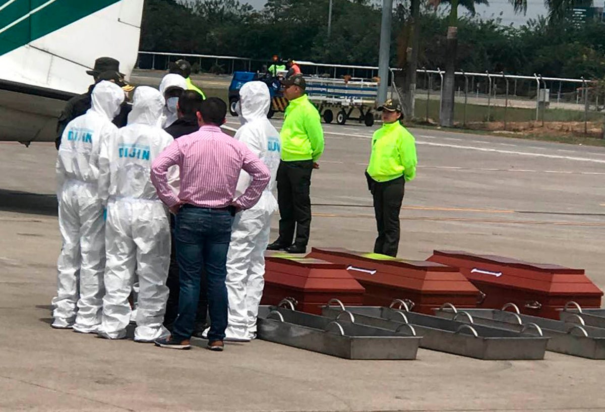 En un avión de la Policía Nacional llegaron al Aeropuerto Internacional Alfonso Bonilla Aragón, de Palmira, los cuatro cuerpos encontrados por las autoridades en el departamento de Nariño y que al parecer pertenecen tres de ellos a los representantes del diario El Comercio de Ecuador.