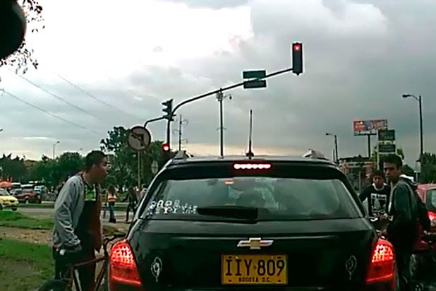 Una vez sucede el choque, otros hombres llegan en bicicleta para atemorizar al dueño del vehículo para así poderlo robar.