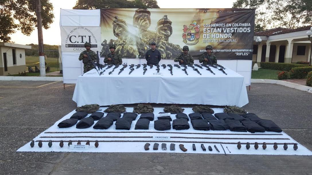 En este sitio se hallaron 18 fusiles Ak-47 con cinco proveedores, nueve fusiles M-14 calibre 7.62 mm, una ametralladora M-60 E 4 y dos cañones adicionales para la misma, una pistola Jericó, 15 granadas de mano IM-26, entre otros implementos de guerra.