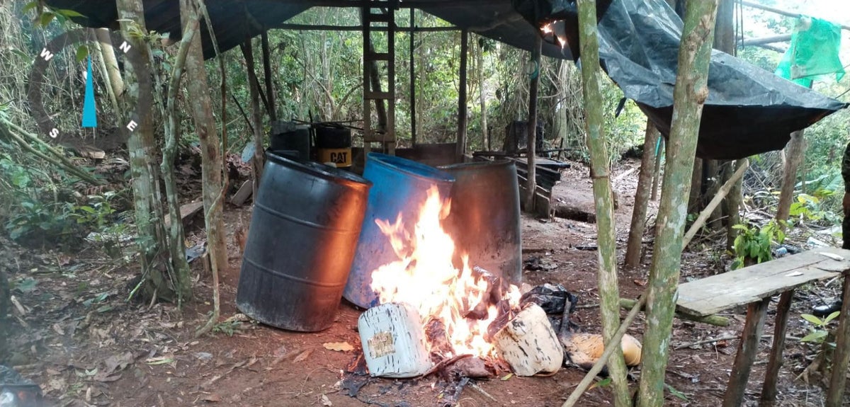 Durante el procedimiento se destruyeron tres estructuras en madera con 120 galones de pasta base de coca , 520 galones de ACPM, 70 kilos de hoja de coca, 125 galones de gasolina, 48 canecas y tres prensas artesanales.