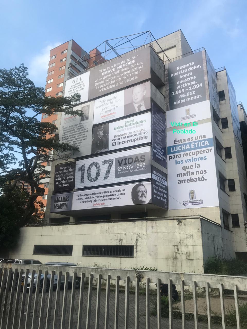 Los carteles exaltan a los 614 policías que fueron asesinados por Pablo Escobar, así mismo como a las 46 mil 612 víctimas que dejó la guerra con el Cartel de Medellín en las décadas de los 80 y 90. Se trata de la campaña previa a la implosión del edificio, programada para el viernes 22 de febrero del 2019, tal y como fue anunciado por el alcalde Federico Gutiérrez.