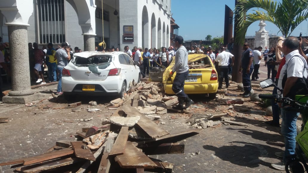 El desprendimiento del balcón del Edificio Maineron, uno de los inmuebles contiguos a la Plaza de la Aduana, ocasionó afectaciones a un taxi y a un vehículo particular que transitaban por esa zona del Centro Histórico de Cartagena.