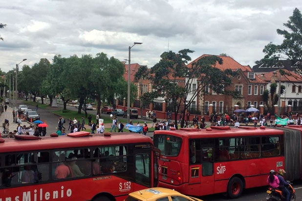 Un numeroso grupo de personas, conformado principalmente por estudiantes de universidades públicas se han tomado el carril exclusivo de sistema de transporte masivo de Bogotá, Transmilenio, de la Avenida Caracas.
