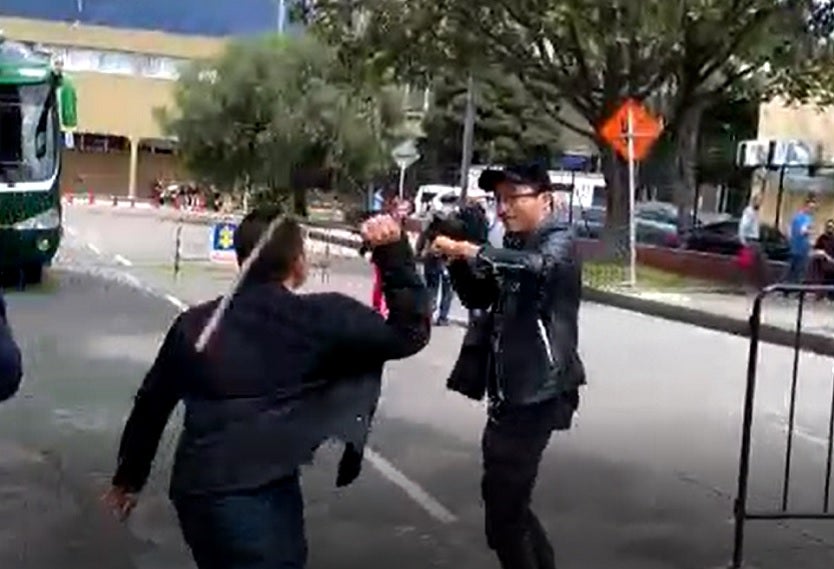 El periodista César Flechas, de Caracol Radio, estaba grabando lo ocurrido y le hizo esta pregunta al agresor: "¿Por qué agrede a la prensa?".