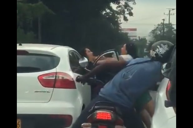 Cuatro mujeres armaron un trancón en la vía Cali-JamundíComo se puede ver en un video difundido en YouTube, una mujer vestida con una pantaloneta verde empezó a reñir con otra que estaba en un vehículo KIA.