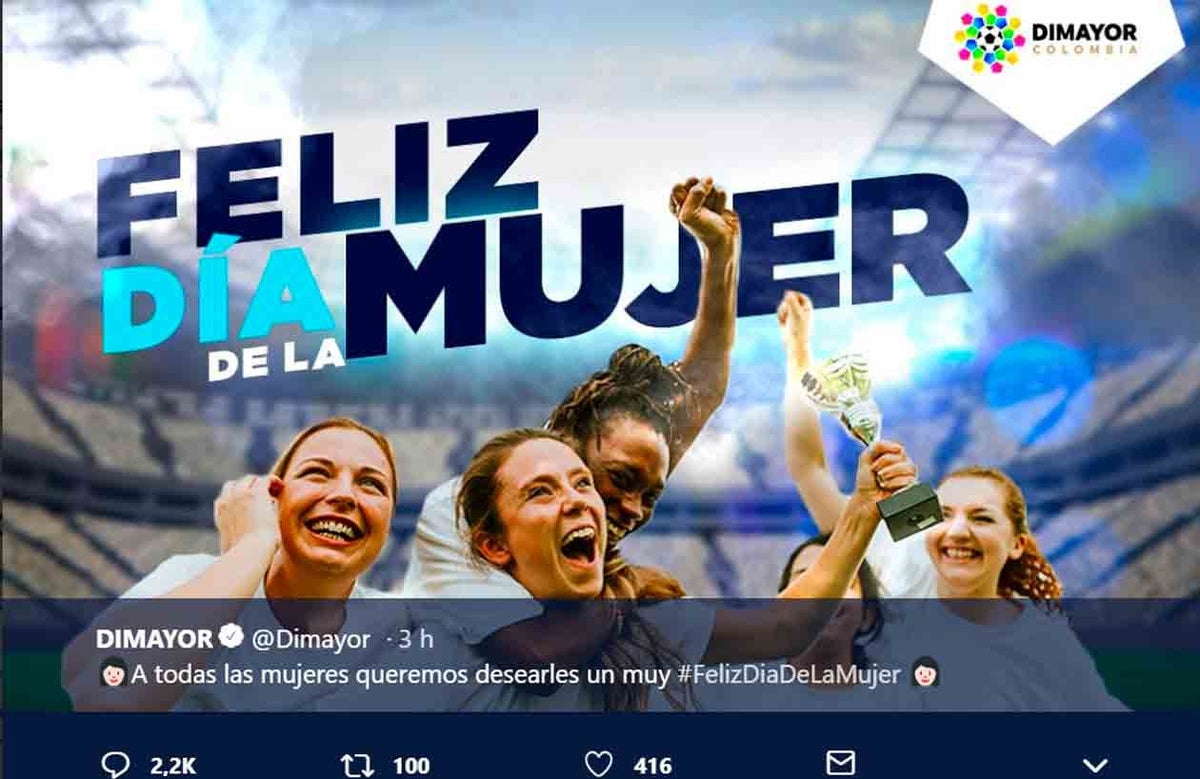 Dimayor publicó un simple mensaje: “A todas las mujeres les queremos desear un muy feliz día de la mujer”, acompañado de una imagen con el logo de la entidad y unas mujeres con camiseta blanca aparentemente celebrando.