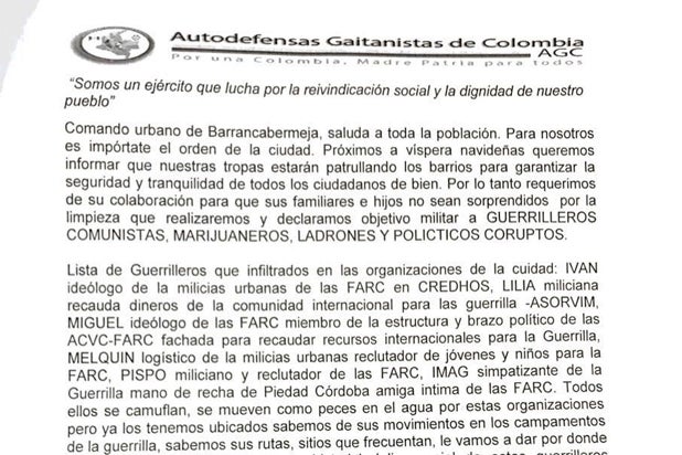 Por estos días en Barrancabermeja, Santander, rondaron panfletos por parte de las Autodefensas Gaitanistas.