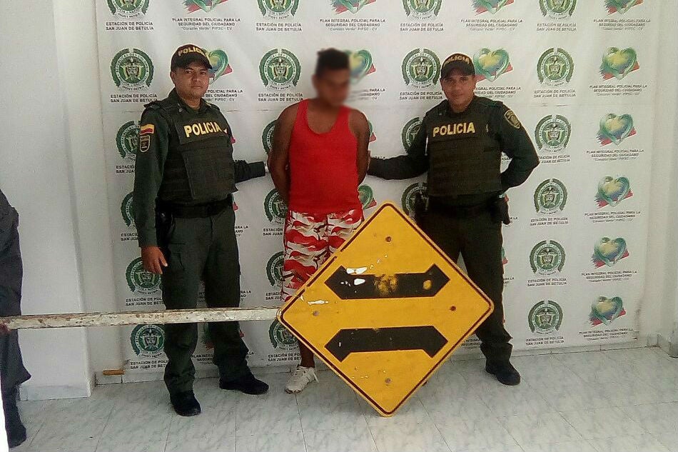 Uniformados de la Policía de Sucre capturaron a un hombre que cargaba, en sus hombros, una señal de tránsito. La curiosa escena se registró en la vía que comunica a los municipios de San Juan de Betulia y Corozal, en el oriente del departamento.