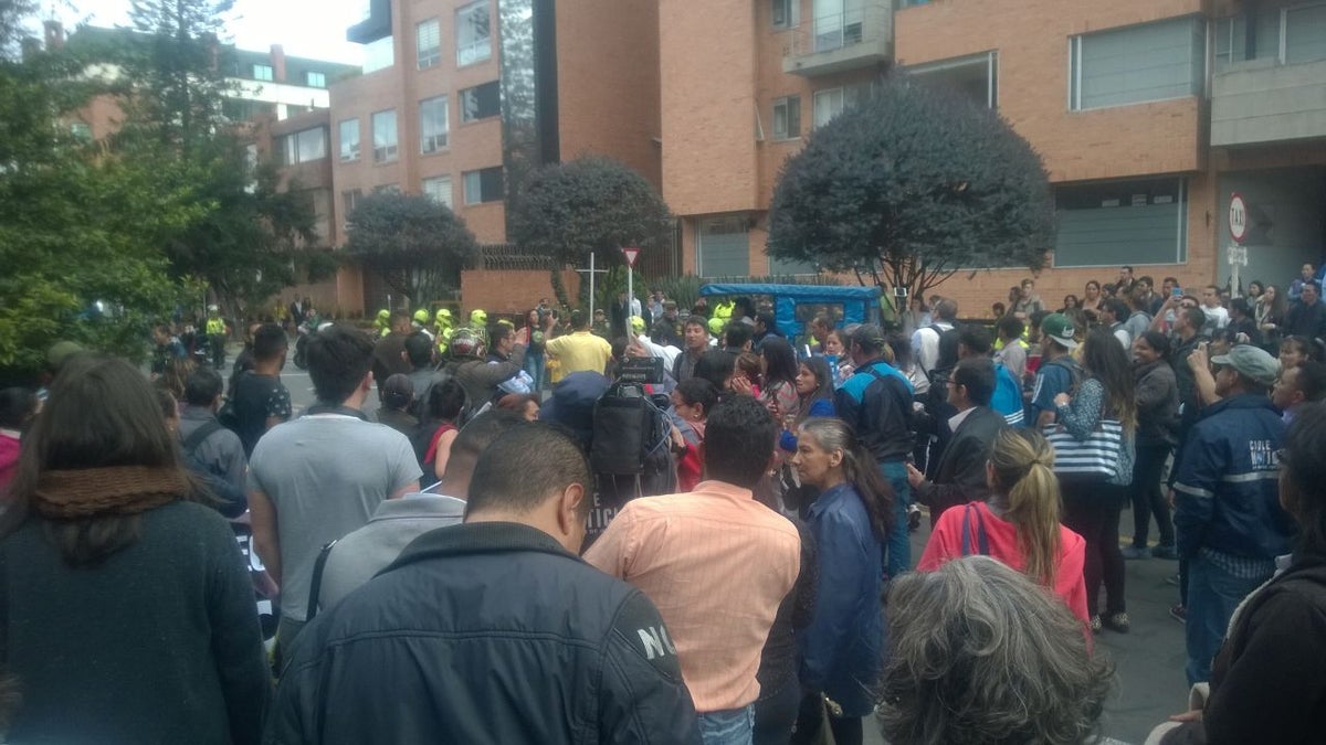 Manifestantes en el momento en que Rafael Uribe dejó, en tanqueta, la Clínica Navarra: