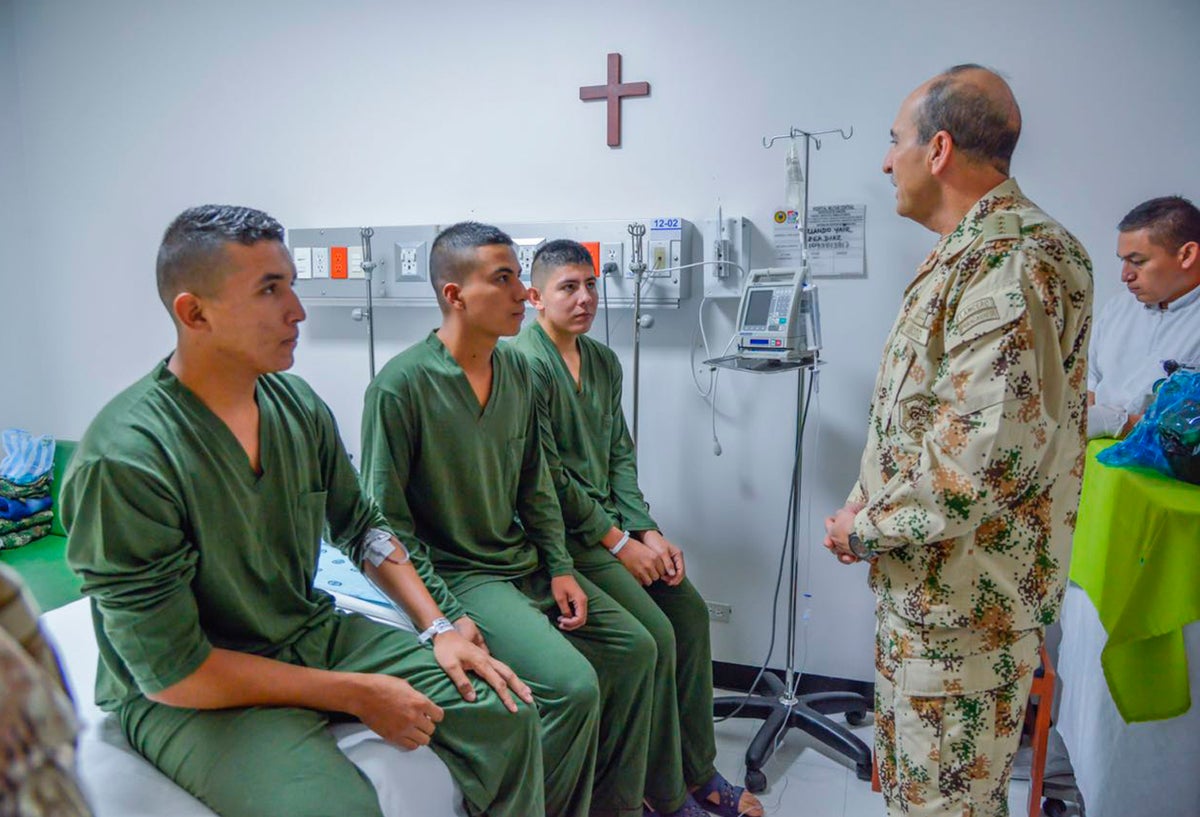 Los uniformados Eduard Caro, Yair Vega y Juan Pablo Rojas, quienes estuvieron retenidos durante casi un mes, recibieron la visita del general Ricardo Gómez Nieto, comandante del Ejército, quien conoció el parte sobre su estado de salud.