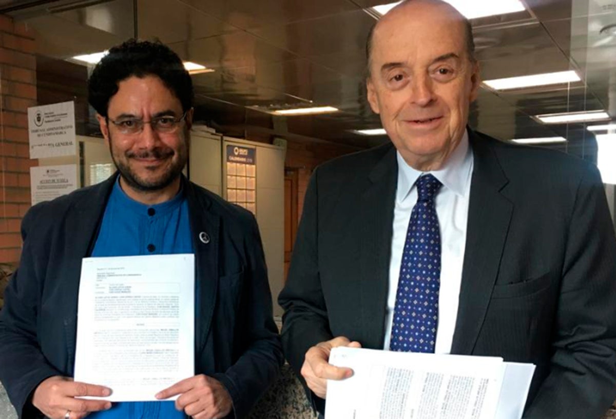 Iván Cepeda y Álvaro Leyva con la tutela que radicaron contra el presidente Iván Duque, en Bogotá Crédito: Foto suministrada por el congresista Iván Cepeda
