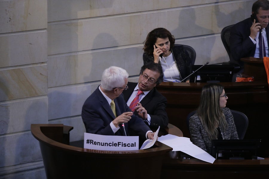 Los senadores Jorge Robledo y Gustavo Petro durante el debate a Néstor Humberto Martínez en el Congreso de la República Crédito: Foto de Colprensa