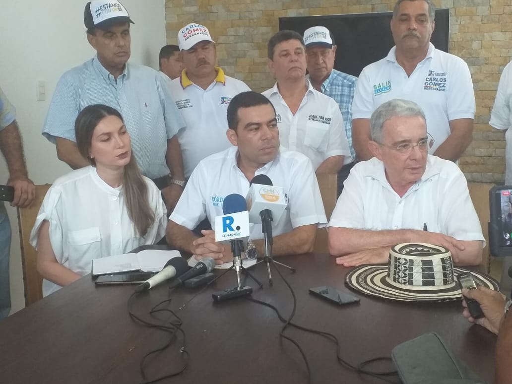 El expresidente y senador Álvaro Uribe Vélez, en rueda de prensa realizada en Montería, ratificó el apoyo al candidato del Centro Democrático, Carlos Gómez Espitia, pese a unas grabaciones que lo comprometen con el exgobernador de este departamento, Alejandro Lyons, vinculado a actos de corrupción.
