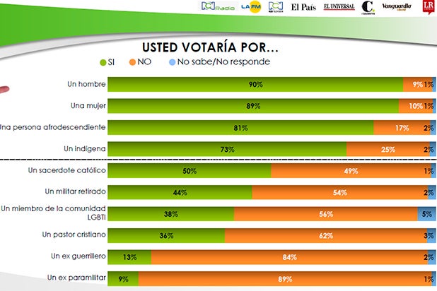 Las respuestas indican que el 90 por ciento de los colombianos votaría por un hombre, que el 89 por ciento lo haría por una mujer, que el 81 por ciento también depositaría su voto por una persona afrodecescendiente, el 73 por ciento de los consultados por un indígena y un 50 por ciento por un sacerdote.