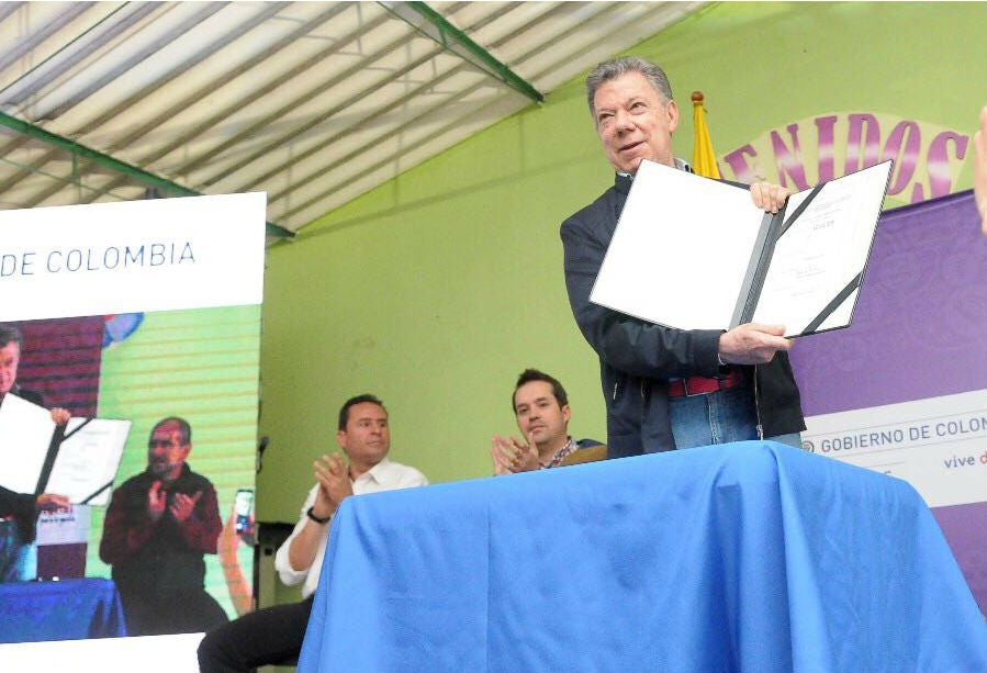 Presidente Juan Manuel Santos tras promulgar la Ley Bicentenario. Crédito: Foto tomada de la cuenta en Twitter: @JuanManSantos