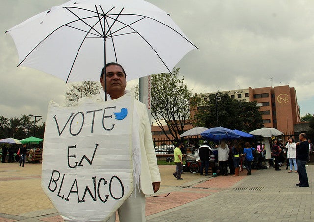 Según la Misión de Observación Electoral, el voto en blanco es un candidato más. Los sufragios depositados en blanco siempre serán sumados al voto en blanco y no a ningún aspirante electoral.