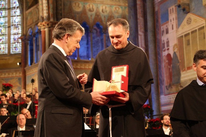 El presidente Juan Manuel Santos recibió la orden franciscana 'Lámpara de la Paz', en Asís Italia, al término de su viaje por Europa donde recibió el premio Nobel de Paz.