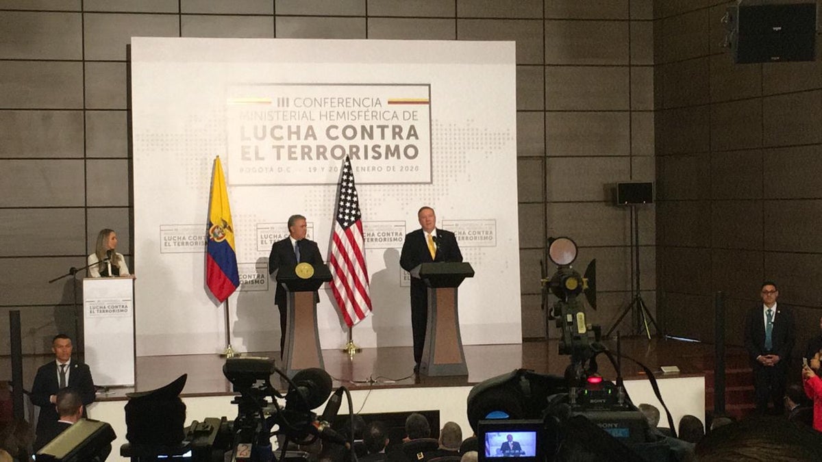 Durante la cumbre antiterrorismo, que se desarrolló en la Escuela General Santander en Bogotá, el secretario de Estado de los Estados Unidos, Mike Pompeo, apoyó las denuncias que han venido haciendo sectores de oposición sobre la presencia de grupos terroristas internacionales en el vecino país.