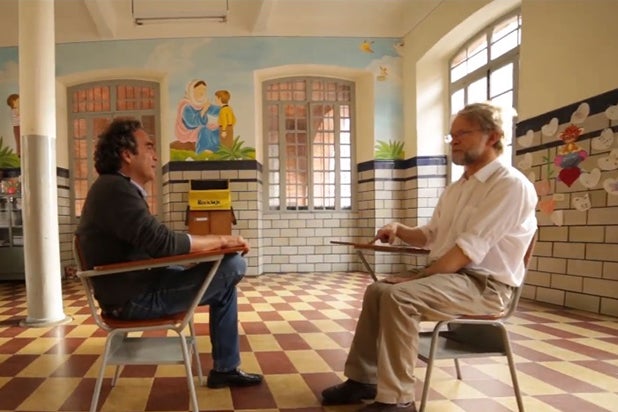 La entrevista comienza con Mockus y Fajardo en un salón de clases y el aspirante a la Presidencia de la República escribiendo la frase "con educación todo se puede".