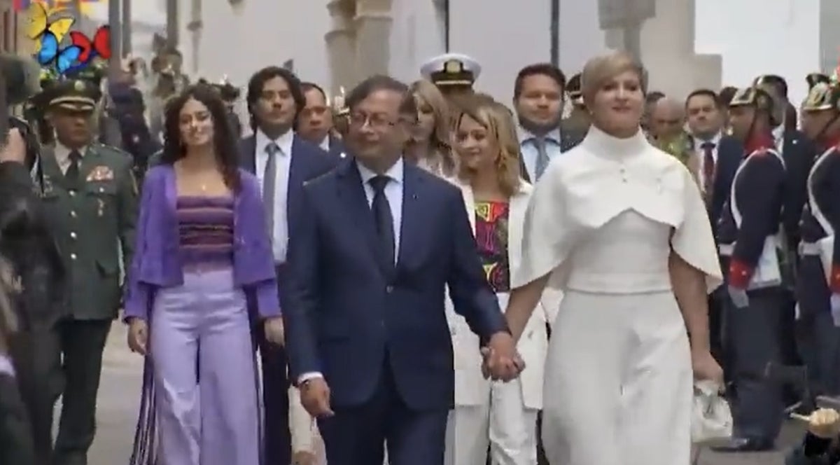 Alcocer apareció cogida de la mano de Petro, vestida con un enterizo de color blanco, un hecho casi inédito en las recientes posesiones presidenciales, donde las primeras damas lucían vestidos.