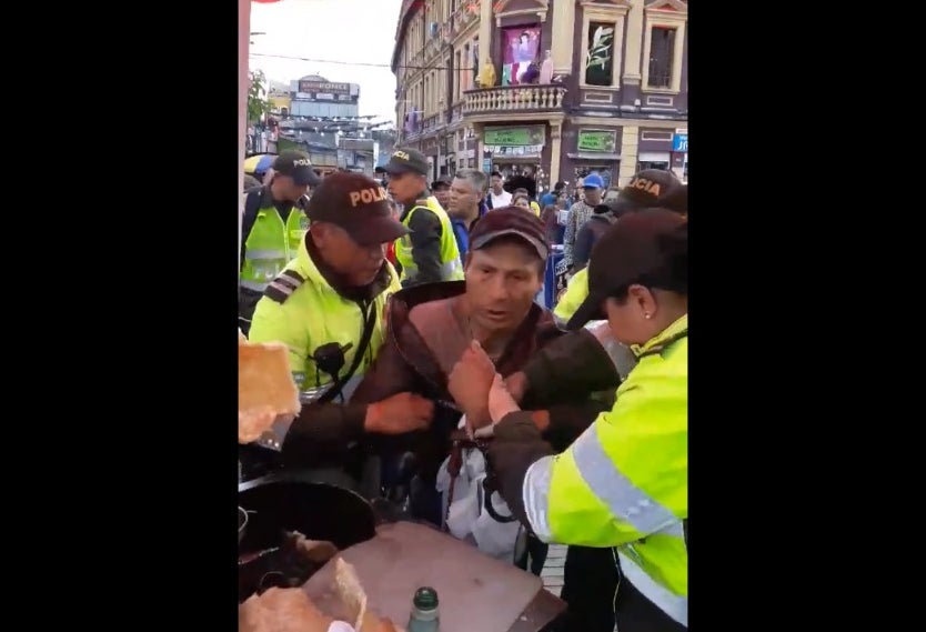 En las imágenes se ve que, ante la negativa del trabajador informal de retirarse del sitio, un grupo de unos diez policías lo rodean e intentan separarlo del carro en el que ofrecía sus productos.
