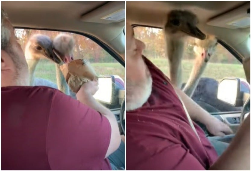 El gracioso momento quedó registrado en un video grabado por una de las personas que iba con el hombre en el vehículo, viralizándose con rapidez. En él, se observa cuando el conductor le ofrece una bolsa abierta y llena de comida a dos avestruces. Estos completamente hambriento comienzan a escarbar sin vacilación mientras que el hombre asegura que se están volviendo un poco agresivos.