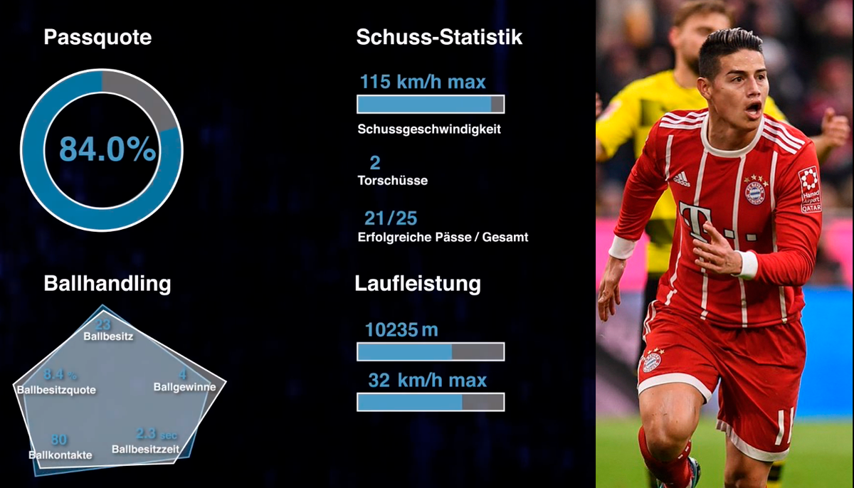 Gracias a que la herramienta analiza y compara este enorme volumen de información un entrenador, como puede ser el de Bayern Munich, puede tener datos en tiempo real que le ayuden a determinar el mejor momento para realizar el cambio de un jugador o para tomar la decisión adecuada cuando se debe elegir si James Rodríguez u otro deportista deben cobrar un tiro libre o un penalti.