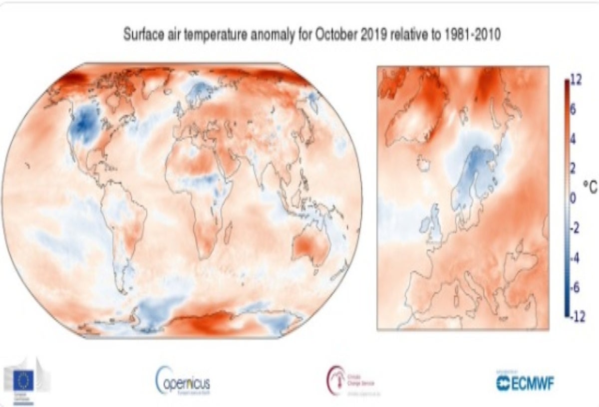 Octubre de 2019 fue 0,63 ºC superior a la temperatura media del periodo de referencia 1981-2000, superando por muy poco (0,01 ºC) octubre de 2015, pero 1,2 º C por encima de la temperatura del periodo preindustrial