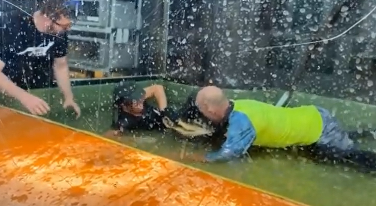Durante el impactante momento, adultos, niños y asistentes estaban atónitos con lo que estaba aconteciendo. Aún así y pese al tamaño del animal, un heroico espectador saltó a la piscina para subirse encima del cuerpo del caimán con el fin de que este no siguiera con los desgarradores giros.