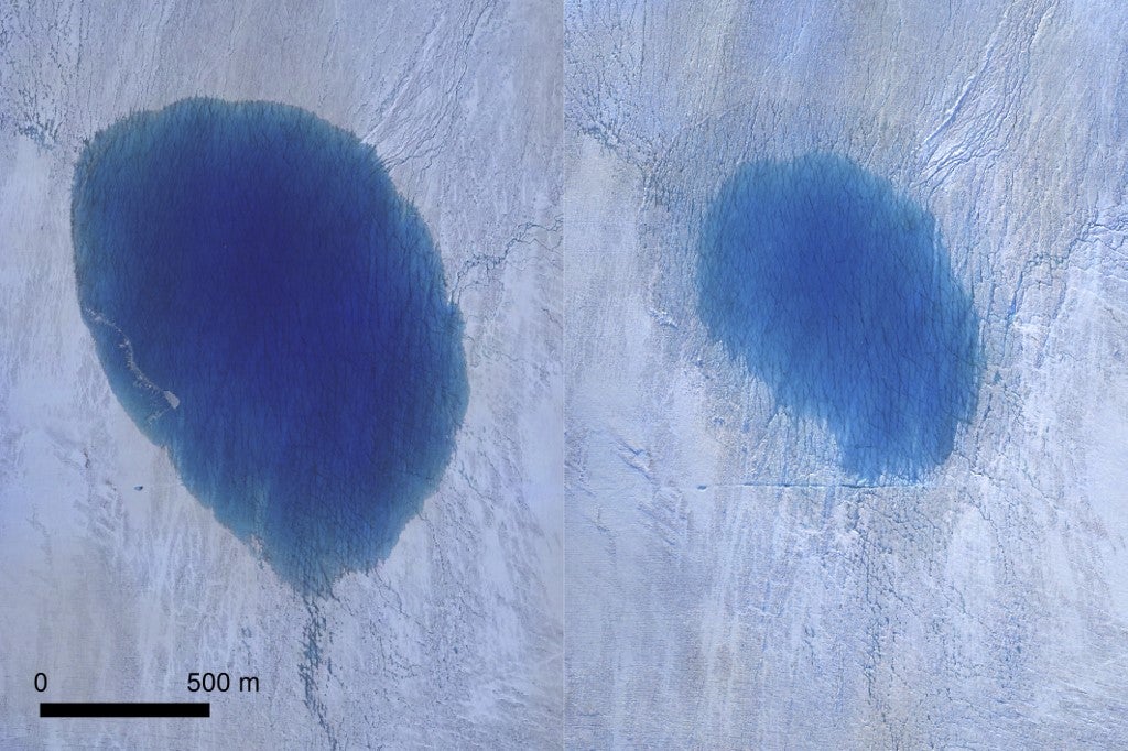 Las fotografías muestran cómo se forman las fracturas bajo los lagos de agua derretida.