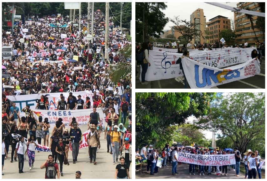 Este 10 de octubre cientos de estudiantes, maestros y rectores de universidades públicas y privadas del país salieron a marchar en las principales ciudades del país para exigir más apoyo del Gobierno Nacional a la educación superior del país.