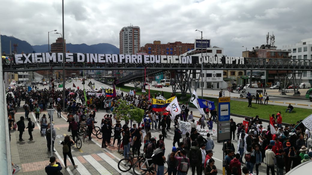 Una vez más salieron a marchar los estudiantes en la ciudad de Bogotá para exigir un aumento en el presupuesto para la educación pública en Colombia. Esta vez, a las movilizaciones se sumaron trabajadores y docentes, quienes salieron a las calles a protestar exigiendo mejores condiciones en sus respectivos oficios.