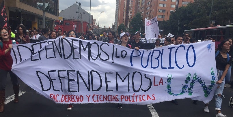 Estudiantes protestando en Bogotá por falta de recursos para la educación pública. Crédito: RCNRADIO
