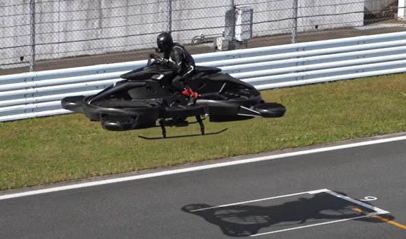 La empresa japonesa la denomina una “hoverbike” y fue presentada en el Fuji Speedway Racing Course con el apoyo de un conductor que la elevó y voló durante un minuto y medio.