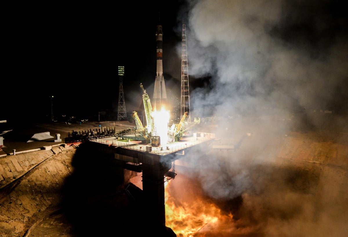La Soyuz despegó a la hora prevista, las 21.28 (16.28 GMT), con ayuda del cohete portador Soyuz-FG y se acoplará a la plataforma orbital en seis horas tras dar cuatro vueltas alrededor de la Tierra.