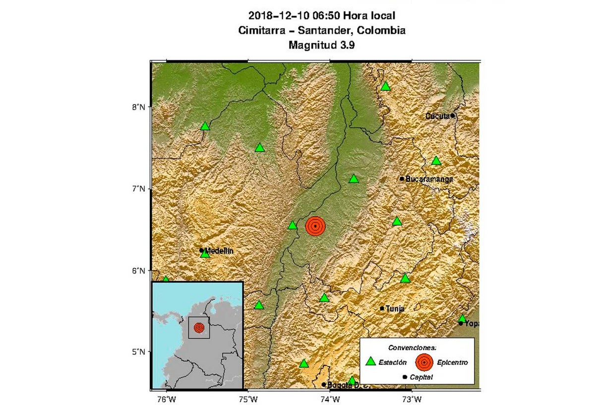 El servicio geológico colombiano ha reportado que registró un evento sísmico de magnitud 3.9 y profundidad superficial (Menor a 30 km), en el municipio de Cimitarra, Santander.