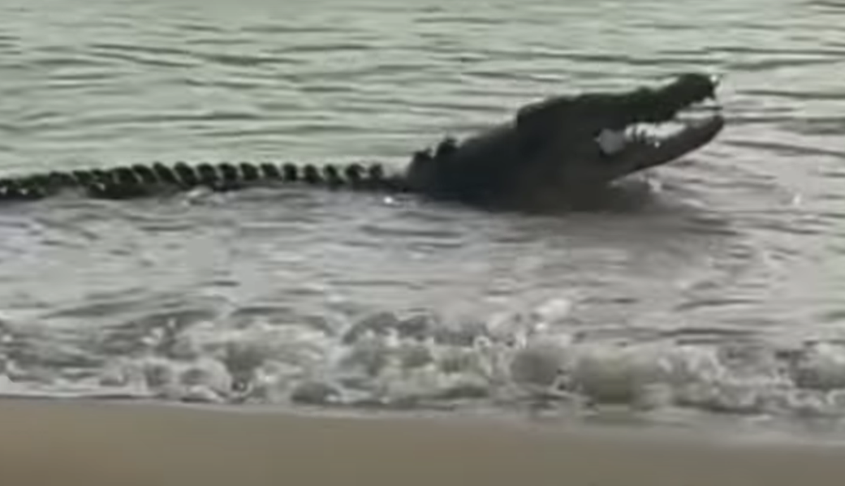Y así fue. En el video se aprecia cómo lentamente el cocodrilo se fue acercando por debajo del agua. Una vez al borde de la playa salió y de un mordisco se llevó el primer tiburón al hocico. Luego avanzó hacia el otro indefenso animal que corrió con la misma suerte.