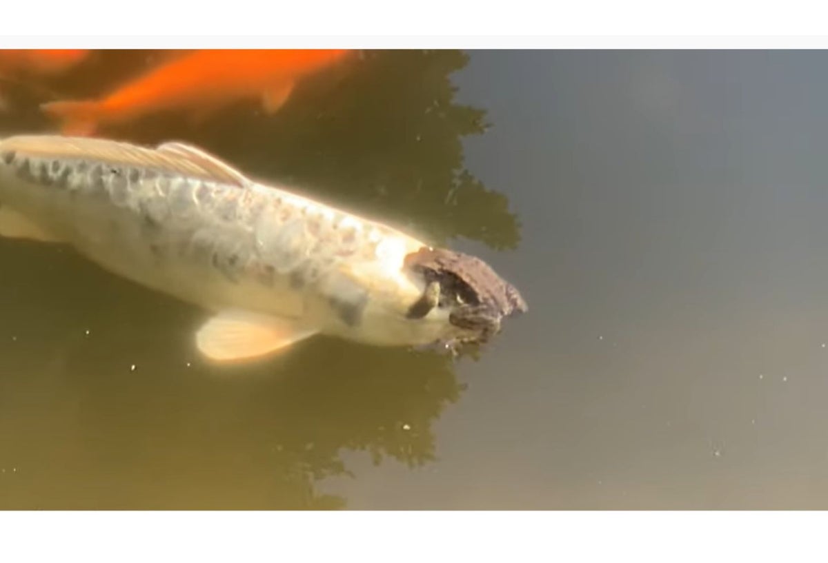Se trata del video que se hizo viral en que se ve a una rana que está subida en el lomo de un pez koi gigante. Como si se tratara de un anfibio perezoso, está posada sobre el pez que nada en un estanque.