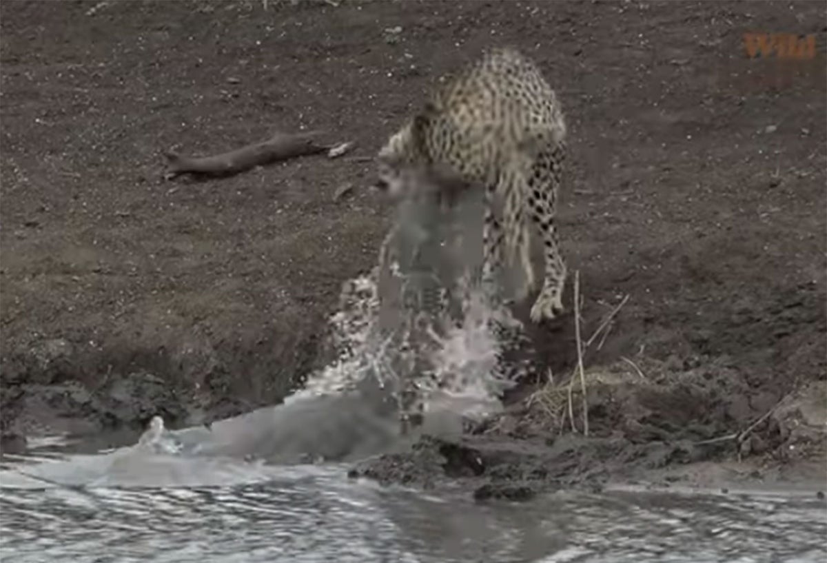 El guepardo, tal vez uno de los más veloces en la faz de la Tierra a alcanzar los 100 kilómetros por hora, no pudo hacer nada para no terminar en la boca del implacable cocodrilo en un hecho que ocurre en pocos segundos.