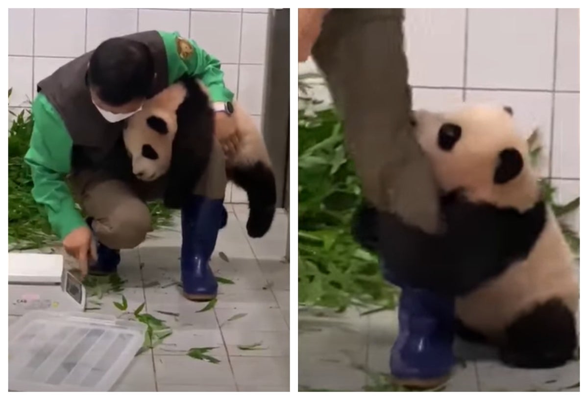 Pero el bebé panda de seis meses, cuyo nombre significa "tesoro que trae felicidad", no parece querer separarse de su cuidador. Fu Bao enrolla entonces sus patas delanteras alrededor de la pierna del cuidador, aferrándose a ella mientras éste intenta alejarse. Ella no lo suelta hasta que él consigue liberarse y Fu Bao se retira.